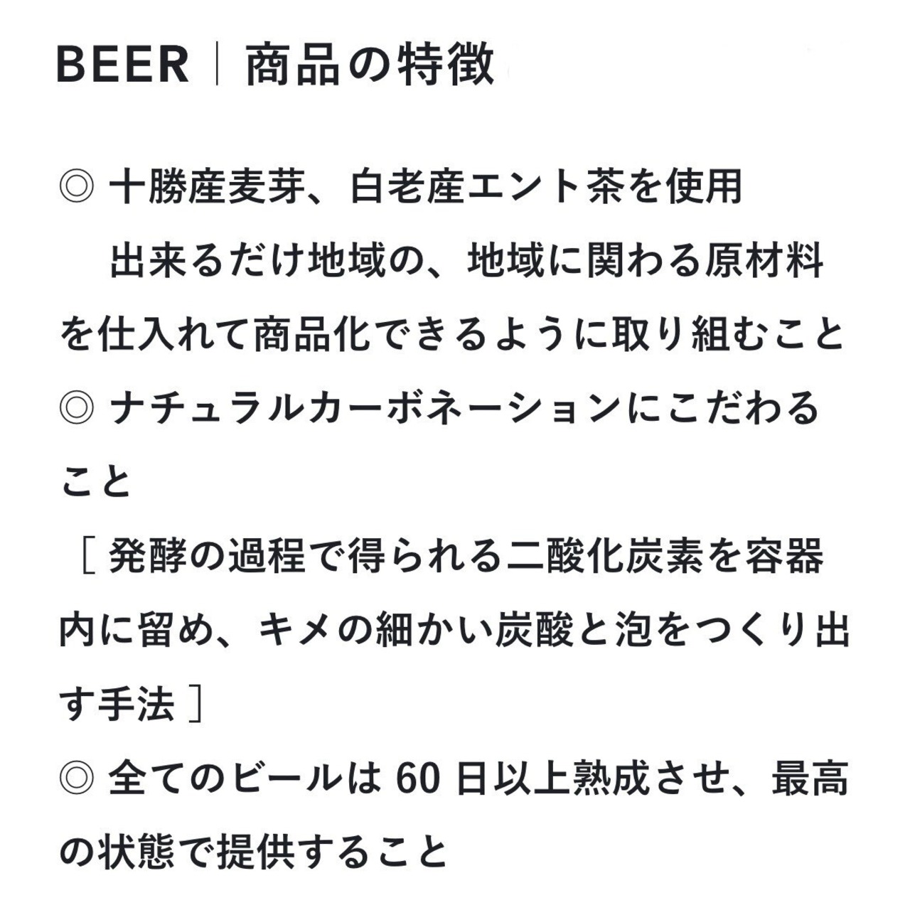 ・ナチュラルカーボネーション[発酵の過程で得られる二酸化炭素を容器内に留め、キメの細かい炭酸と泡をつくり出す手法]にこだわります。